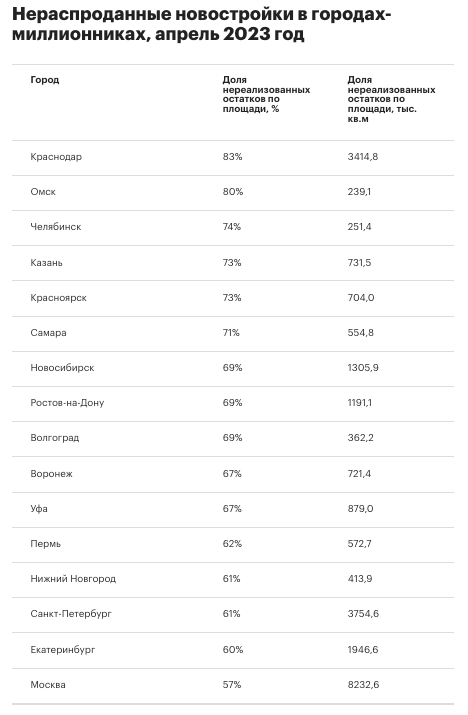 В апреле 2023 года самая высокая доля нераспроданных новостроек в городах-миллионниках была отмечена в Краснодаре - 83% (или 3414,8 тыс. кв.м.).